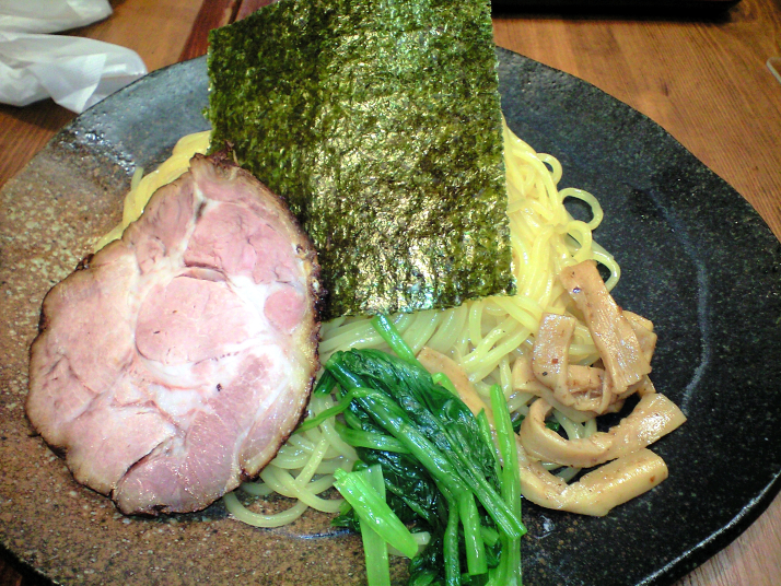 見た目は二郎チックなビジュアル。スープはややライトな印象の豚骨で、味醂?の甘みが結構前面に出ている。ややパンチに欠けるか。麺は浅草開化楼製だと言うことだが、何となく茹で過ぎな印象。そして量もちょっと物足りない感じを受ける。つけ麺は300gとのことだが、こちらは200gもあるだろうか。チャーシューは見た目固そうに見えるが、実際は結構柔らかく箸で持つと自重で崩れる。スープには一味がチラチラと見え、ヤサイの上には黒胡椒。全般的にジャンク度は低めアッサリ二郎インスパイアと言った感じ